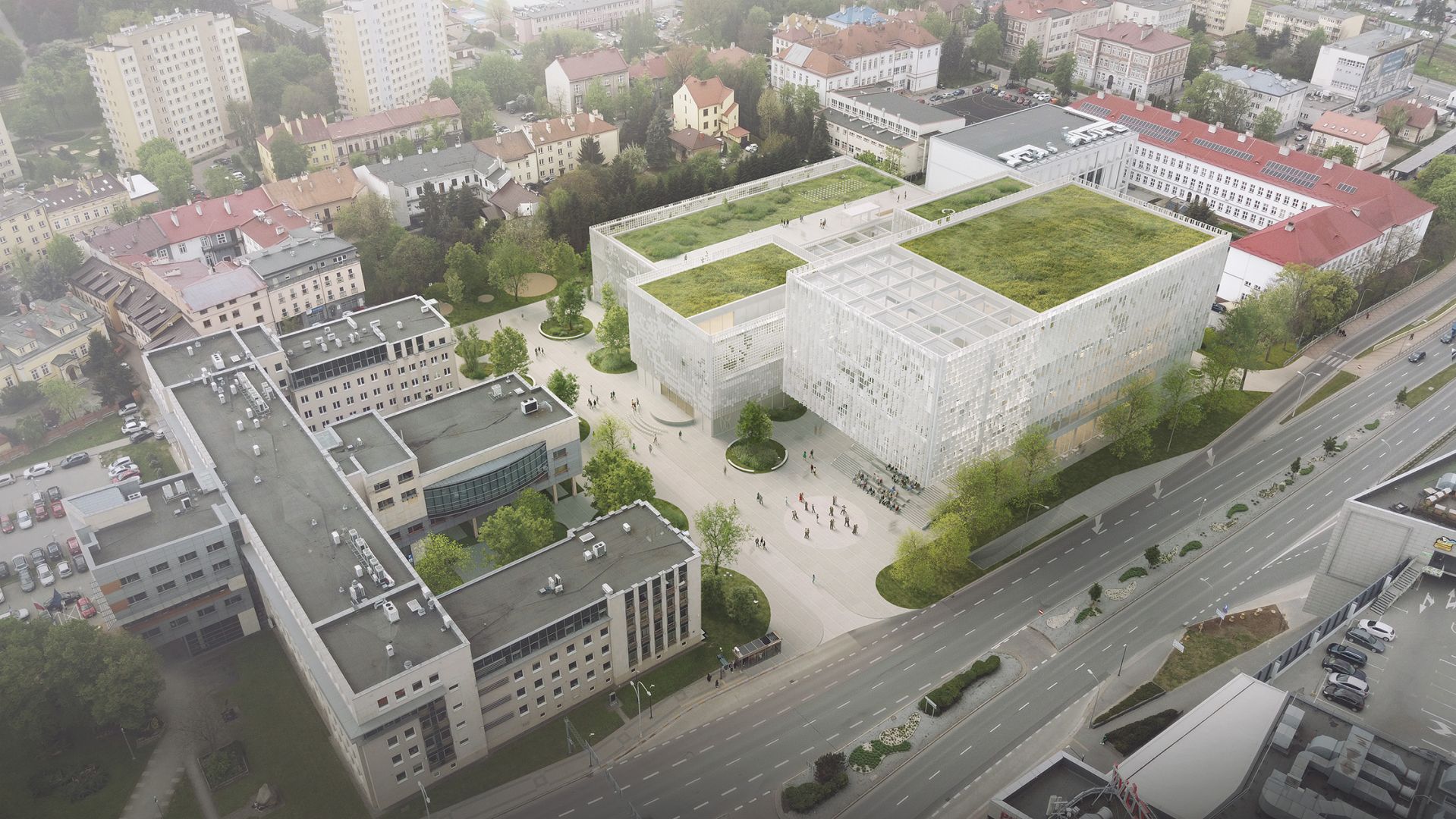 The bond between people and books served as the inspiration for the design of the New Library in Rzeszów. Its architecture interprets the act of reading as a sensory and spatial experience. The entire structure is enveloped in elements reminiscent of the pages of a novel being turned – light, openwork panels that come to life through the forces of nature. The building appears as an ‘urban living room’ – the open, cultural heart of the city, where spending time with others is just as important as engaging with literature.